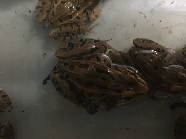 The species of Leopard Frogs are relatively new to Animal Wonders. They came to us during or after their tadpole metamorphosis from various school projects. Having been raised in a classroom with many curious eyes gazing on them, their chances to survive in the wild is slim and now they are a part of our amphibian programs. If you are a teacher workng with this project (often sold through various science education outlets) and need a place for your frog or tadpole after the project or school year ends, please contact us and we'll be glad to help you out.